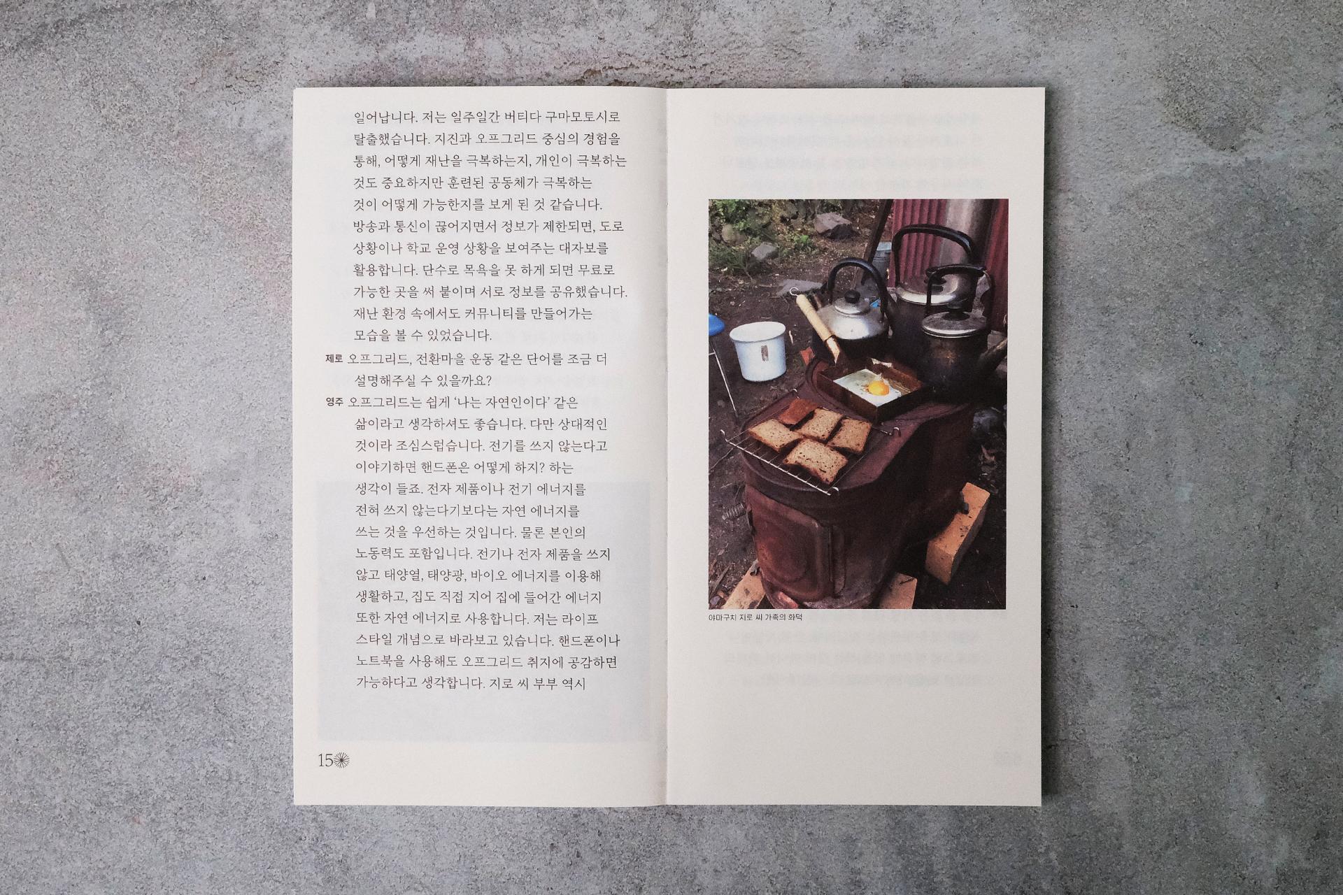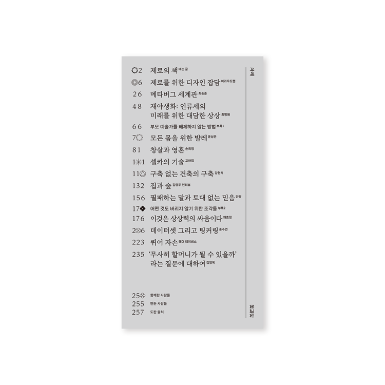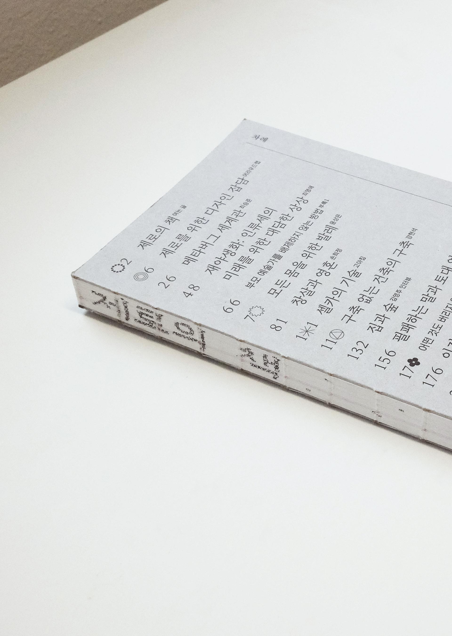 외양이 조금 특이합니다. 앞표지에는 목차를, 뒷표지에는 판권지를 앉혀 책의 정보들을 외부에 노출했고, 정교한 계산을 통해 내지에 넣은 기호 패턴이 노출사철제본으로 엮은 책등에 제목이 되어 드러나도록 디자인했습니다. 표지와 내지 모두 재생펄프 함유율이 100퍼센트인 종이에 콩기름으로 인쇄했고, 4X6 전지의 24절 사이즈로 버려지는 종이를 최소화했습니다. 본문 폰트의 크기는 시원하게 키우고 유니버셜 디자인을 적용해 더 많은 사람이 편히 읽을 수 있도록 했습니다. 제작 과정과 만듦새에 여러 모로 고민이 많이 담긴 책입니다.