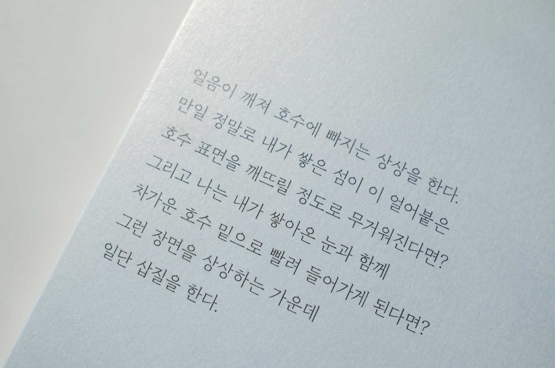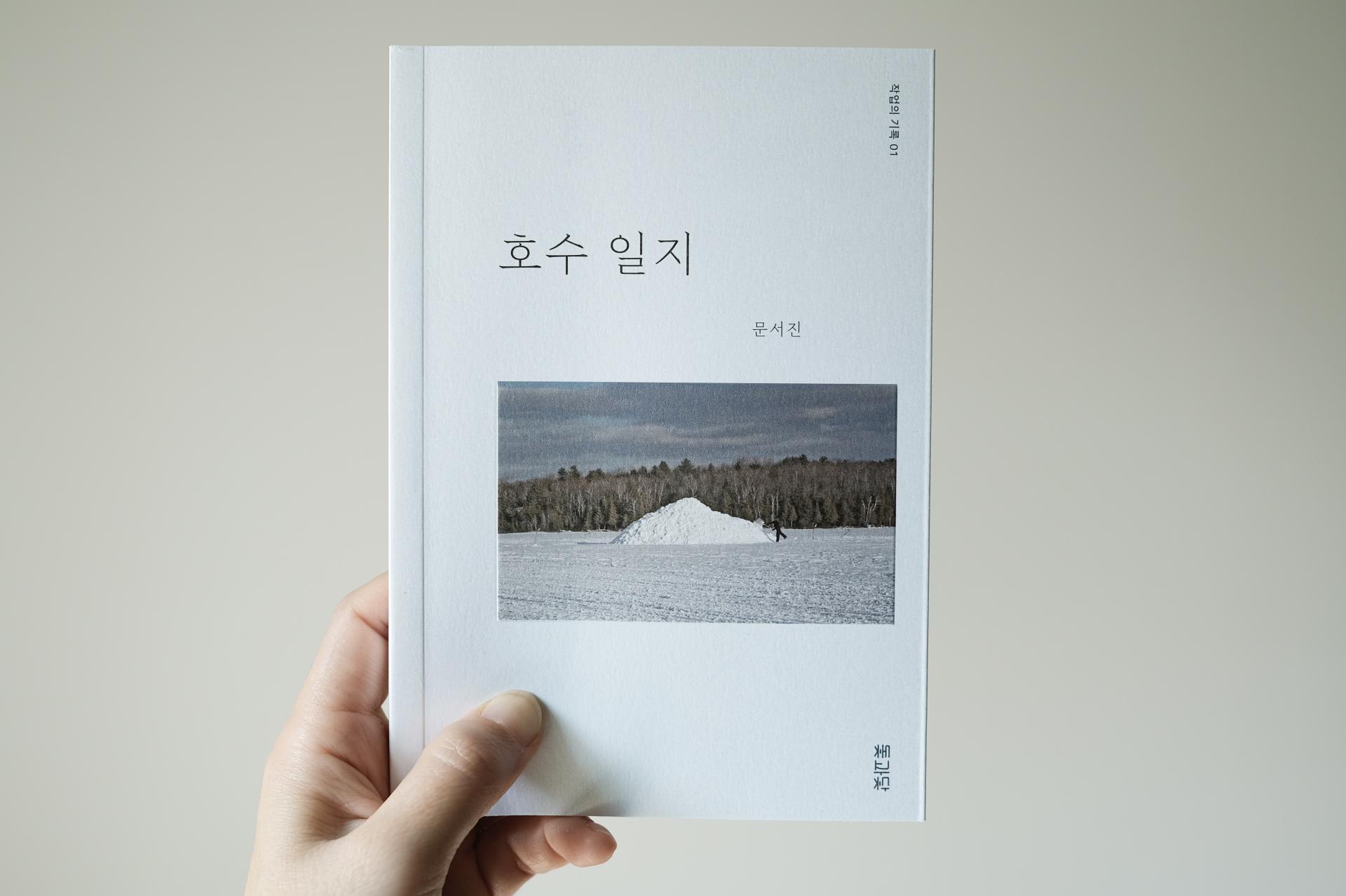 『호수 일지』는 문서진 미술작가가 미국 메인 주의 작은 마을에 한 달간 머무르면서 진행한 작업의 과정을 담은 책이다. 작자는 꽁꽁 얼어붙은 겨울 호수 위에 매일 삽으로 눈을 쌓아올려, 봄이면 사라질 일시적 섬을 만들기 시작한다. 영하의 기온 속에 섬의 면적이 점점 불어날수록 그 무게로 인해 호수의 표면이 깨져 물에 빠질지 모른다는 두려움도 커진다. 하지만 작가는 삽질을 계속한다. 자신이 이 작업을 왜 수행하는지 모르는 채로, 호수가 들려줄 대답을 기다리면서. 그 느리고 고요한 시간이 쌓여 무용하고도 아름다운 삽질의 기록이 되었다.
