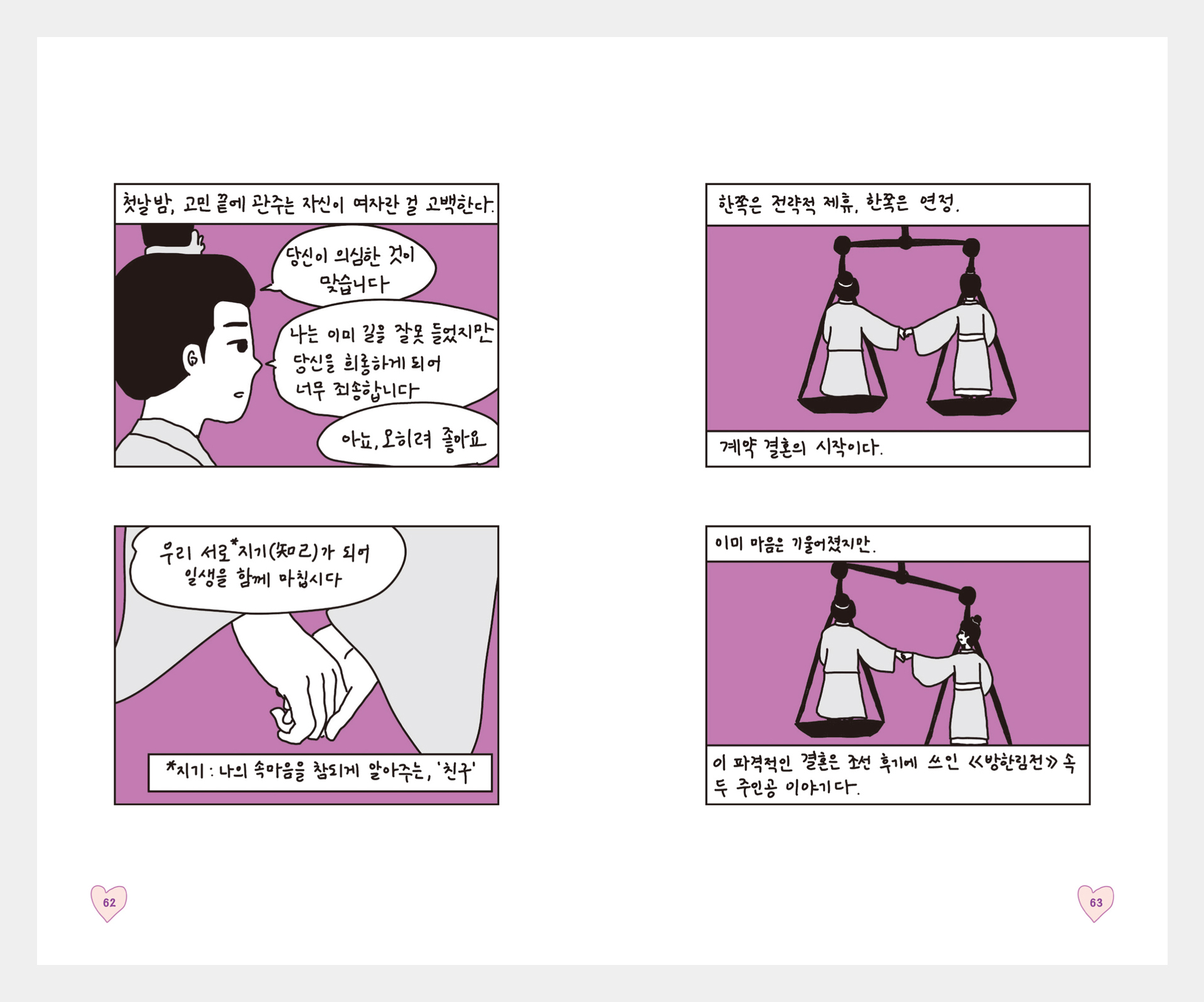 그리고 고전소설을 한 편씩 소개하면서 작가 본인이 소설에 빠진 학창 시절부터 대학원까지 이어지는 고전소설 덕질, 이후 작가로 살아가는 과정에서 생긴 고민과 문제들을 보여주는데 그건 동시대인들의 고민과 닿아있기에 우리의 이야기라는 느낌이 들게 한다. 모든 이야기가 그래서 공감이 되고 친근하게 여겨지는 장점이 있다. 또 서귤 작가 특유의 유머와 능청스러움이 읽는데 재미를 더한다.