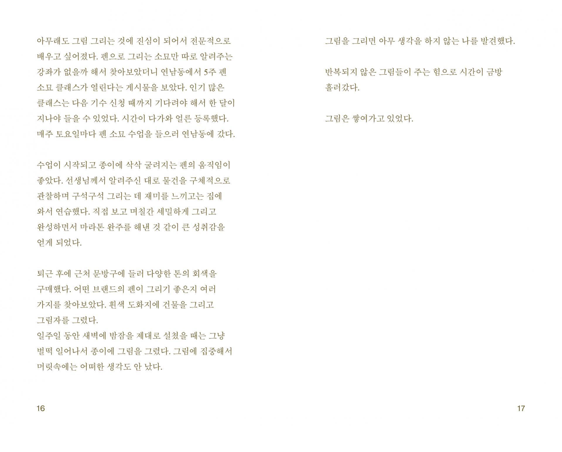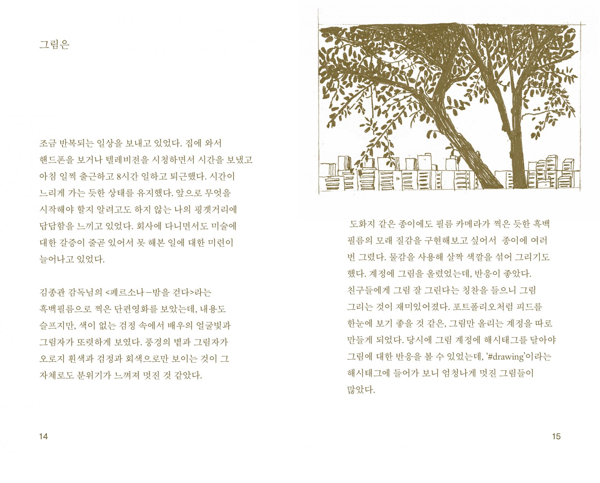 그리고 제 마음을 모아 쓴 글들이 저와 비슷한 시간을 지나고 있는 독자들에게 전해져, 고민의 나날을 보내고 있는 그들에게 드로잉과 글로 따뜻한 안부를 묻고 싶습니다.