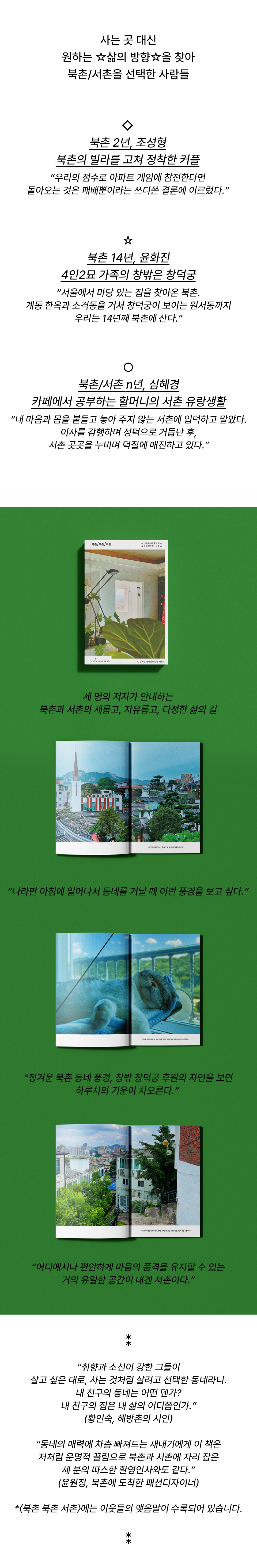 “처음 만났을 때의 떨림. 함께하게 됐을 때의 설렘. 나도 좋아해, 라고 말하는 이들에게 느끼던 질투. 변한 상대에 대한 서운함과 (그것을 받아들이려 애쓰는 과정에서 일어나는) 다툼. 그 후 찾아온 돈독함과 편안함. 이것은 사랑 이야기다. 동네, 북촌, 창덕궁길(모든 존재들)에 대한 사랑 이야기.” (북촌의 등대 같은 ‘동네커피’ 진영 님)