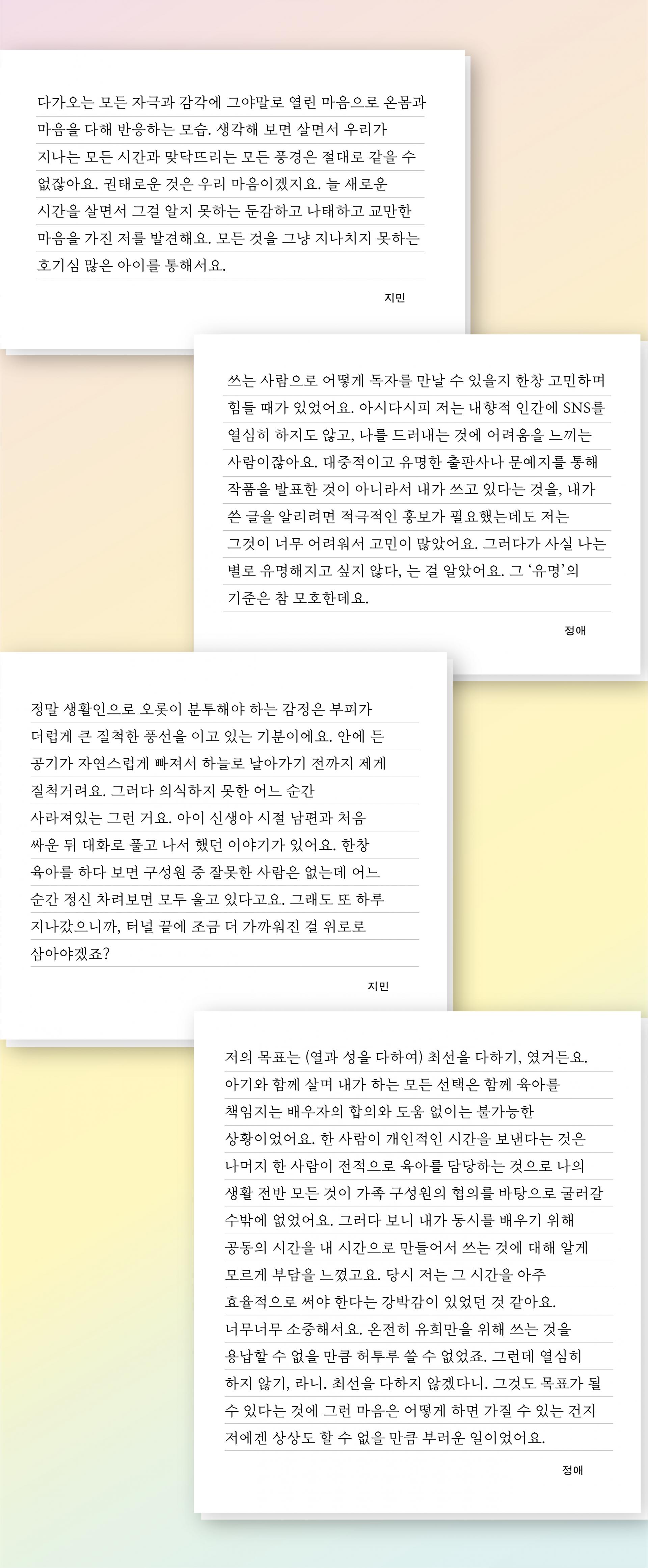 자신만의 목소리를 꾸준히 내며 그동안 들리지 않았던, 당연하게 여겨졌던 '엄마'의 정체성과 한 개인을 둘러싼 다양한 이야기들이 다정한 관계에 기대어 서술됩니다.