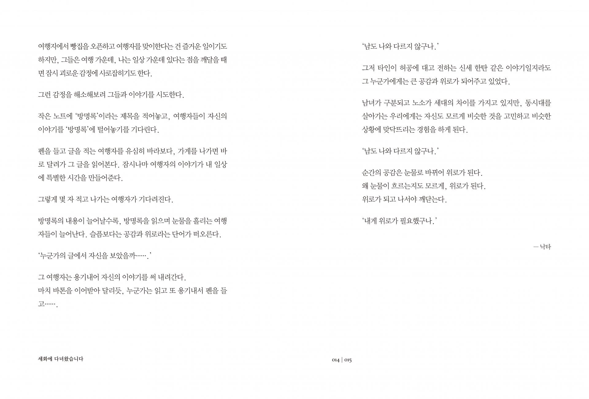 대부분의 글들이 방명록을 옮긴 것이기 때문에 그 누구도 이렇게 한 권의 책으로 엮여질지 모른 채, 여행자들이 자신의 어투로 스스로의 표정을 담아 써 내려간 글들이어서,