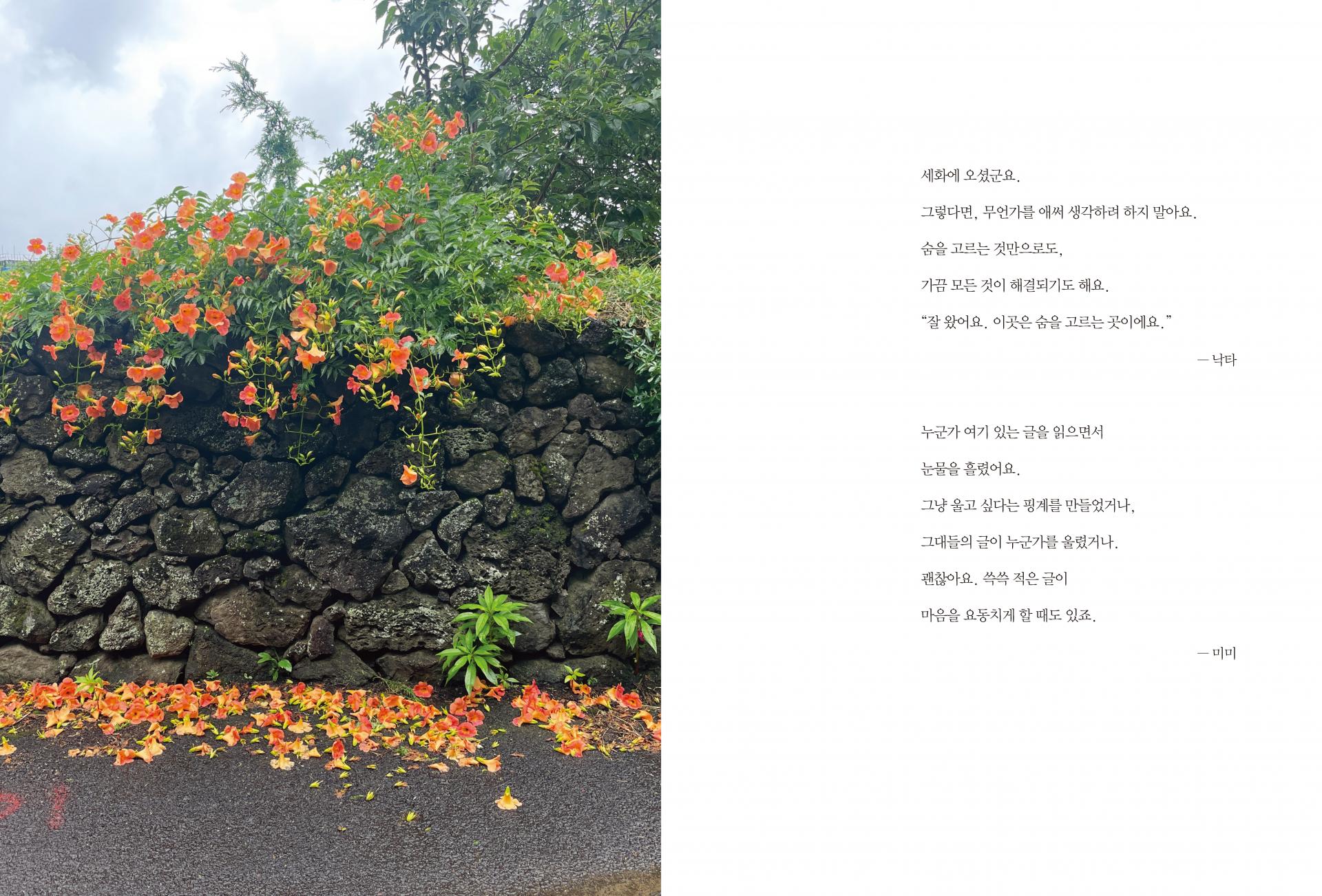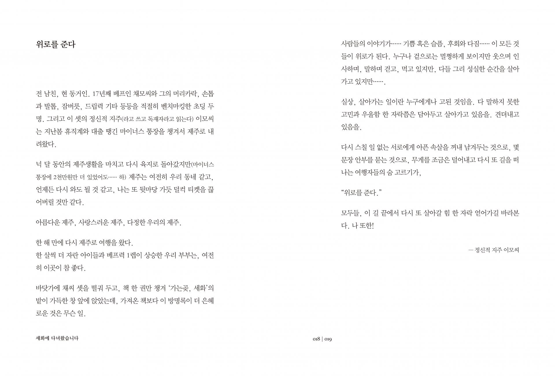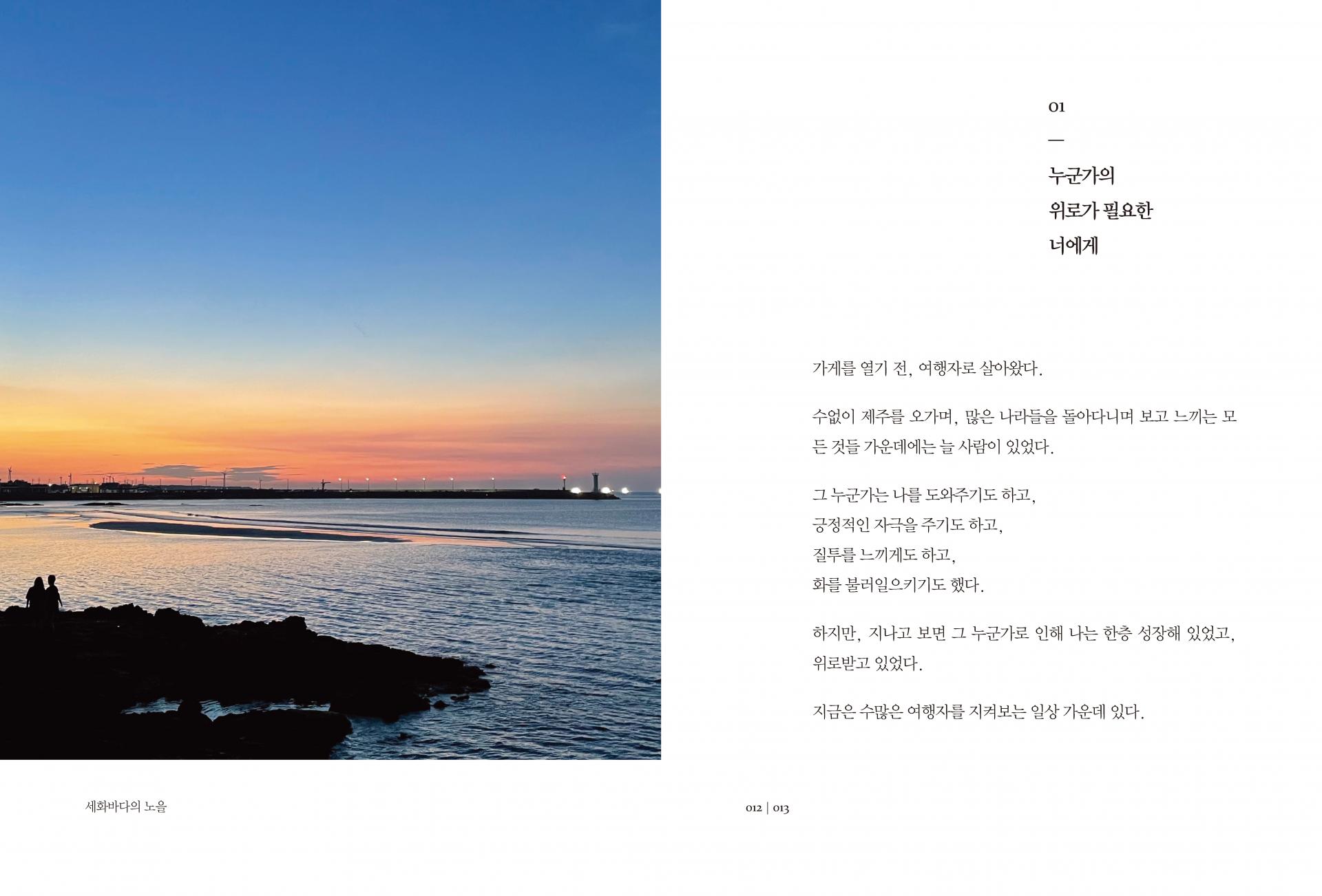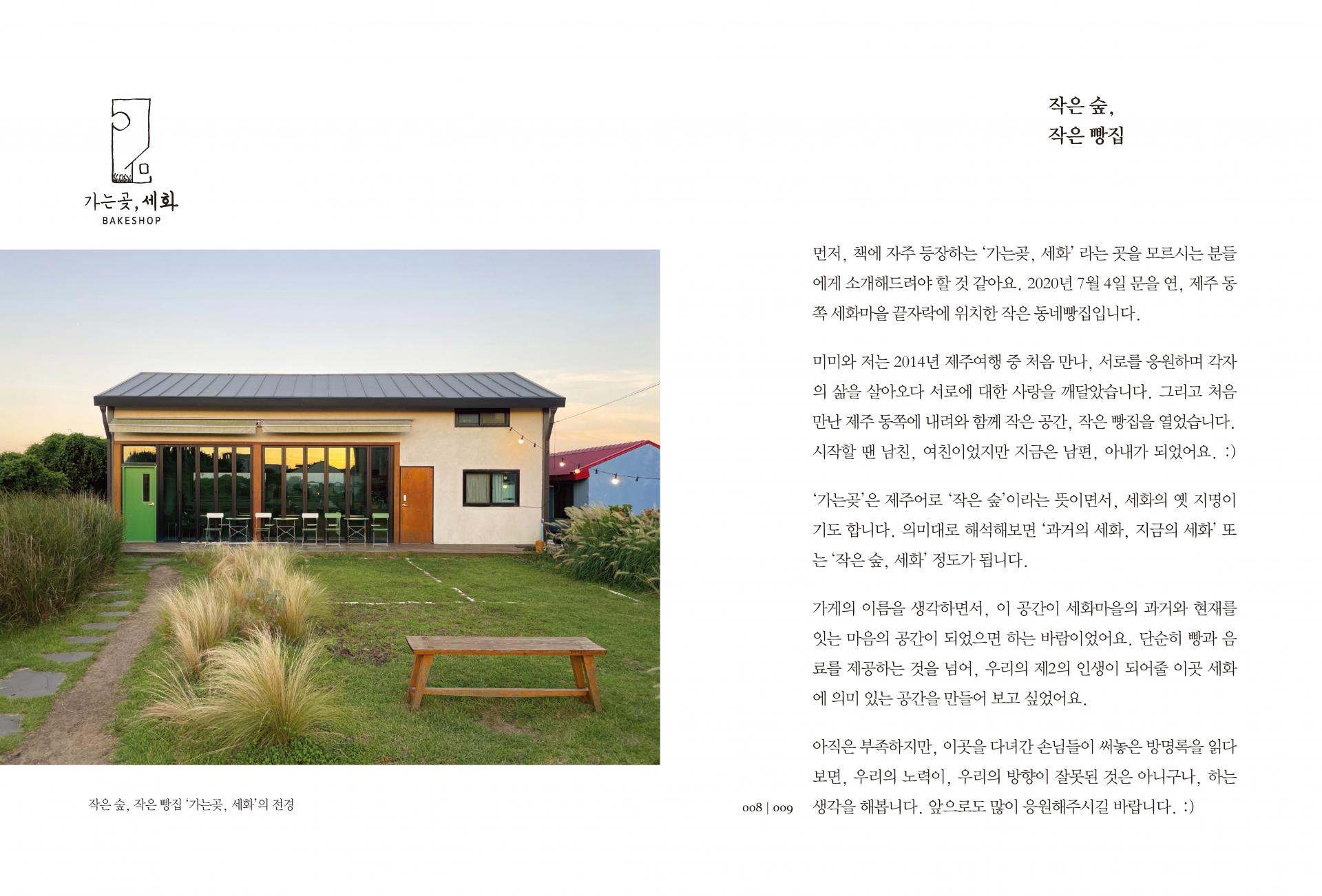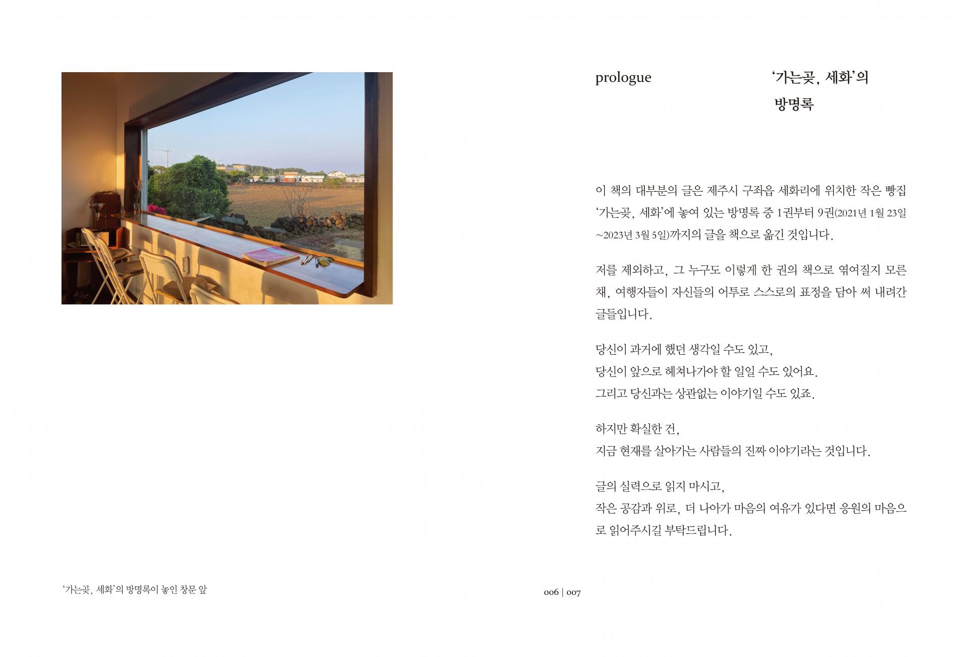 이 책의 대부분의 글은 제주시 구좌읍 세화리에 위치한 작은 빵집 ‘가는곶, 세화’에 놓여 있는 방명록 중 1권부터 9권까지의 글을 책으로 옮긴 것과 이 책의 저자인 허철웅의 개인적 에세이지를 책으로 엮은 것입니다.