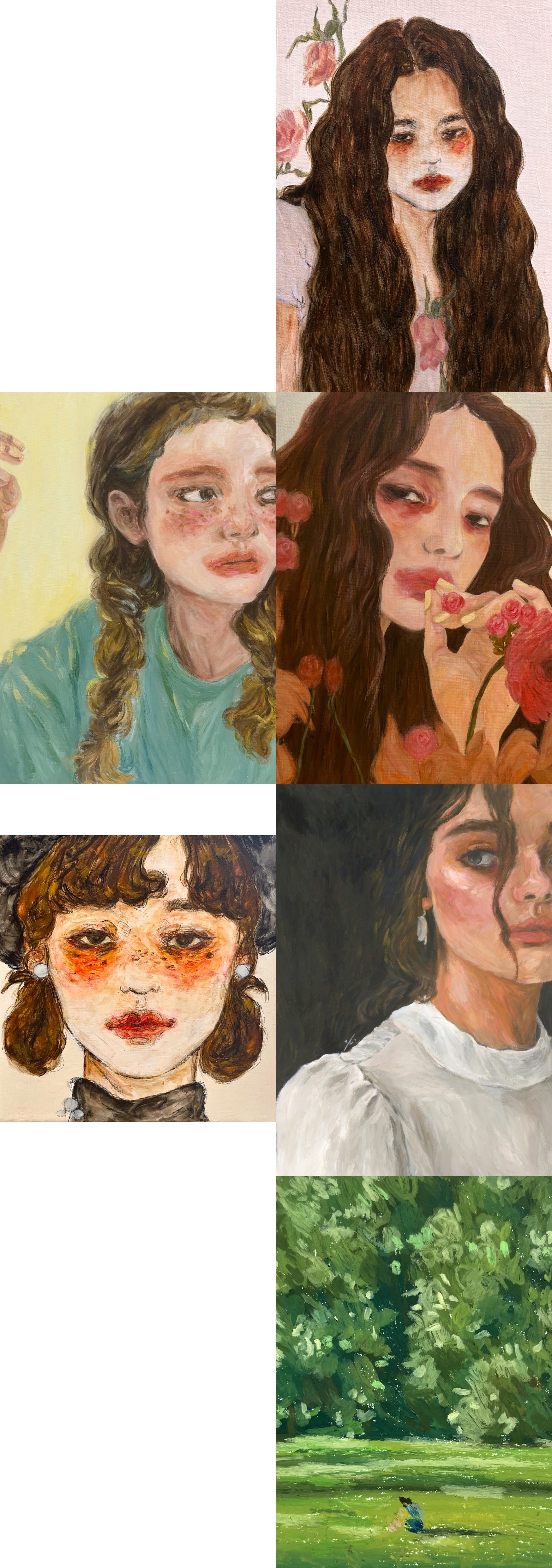 나는 사로잡는 것, 소유하고 싶은 것들에 흔들리는 마음, 아름다움에 대해 작업한다. 주로 음악의 뉘앙스와 느낌, 숨 쉬는 호흡의 흐름과 단어 등을 글과 같은 시각적인 것으로 표현한 뒤 그에 맞는 인물, 풍경으로 재해석하는 과정을 통한다. 색을 칠하고 지워내고 다시 덧칠하며 여러 겹으로 쌓아 올리는 작업은 복잡하고 감춰진 깊은 마음, 부유하는 인물의 감정과 닿아 있다. | |