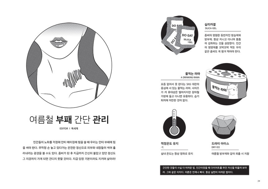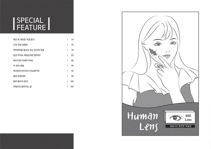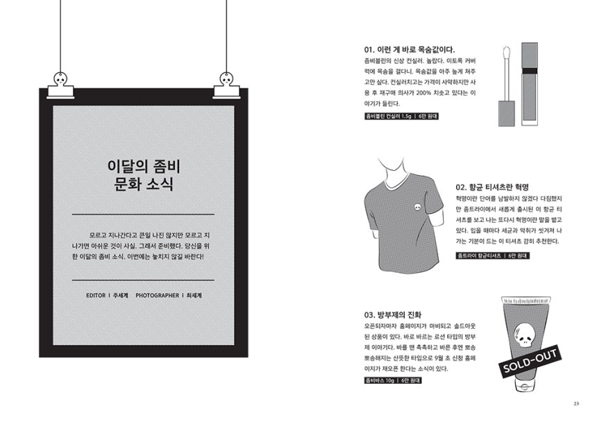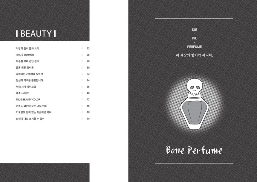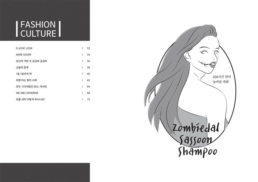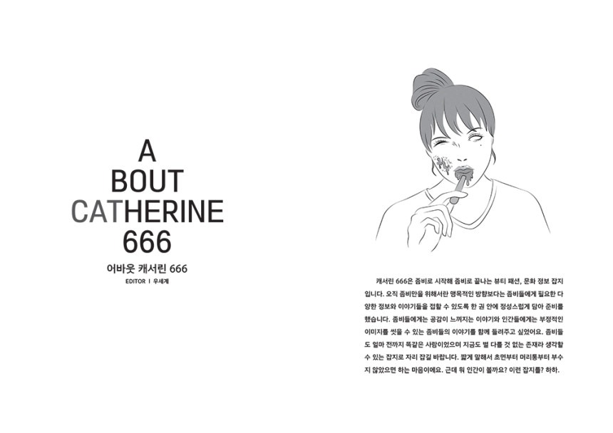 좀비와 잡지가 만난 좀비 패션 잡지 형식의 일러스트 책입니다. 책에 나오는 모든 모델 이름은 캐서린이며 다양한 캐서린을 통해 그려진 좀비를 위한 정보가 담겨 있습니다. 상처 많은 좀비 캐서린들의 뷰티팁이 궁금하시다면 지금 당장 책장을 넘겨 보세요.