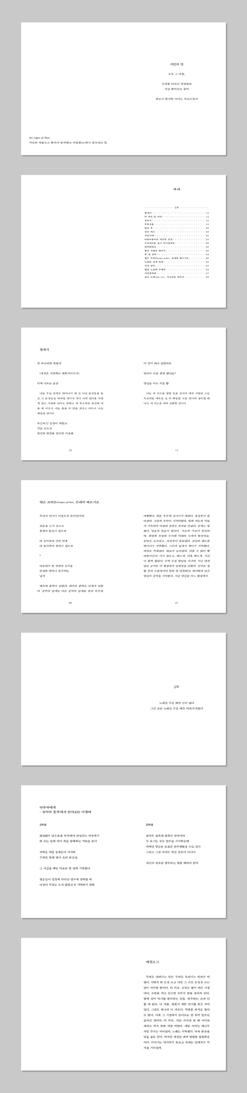 다 카포da capo 라는 연주지시어가 지시하듯, 질주하는 현재를 잠시 멈추고 생의, 문제의, 사랑의, 이야기의, 처음으로 돌아가 새롭게 세계를 바라보자.