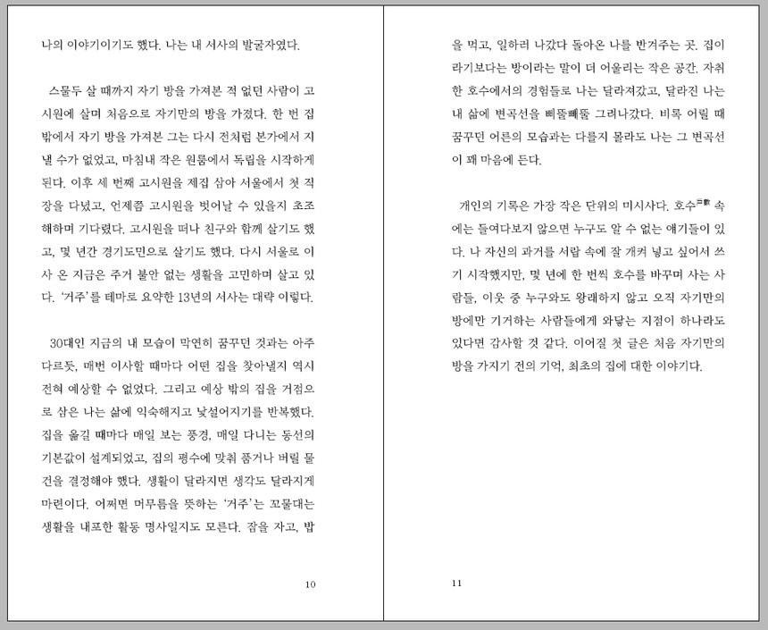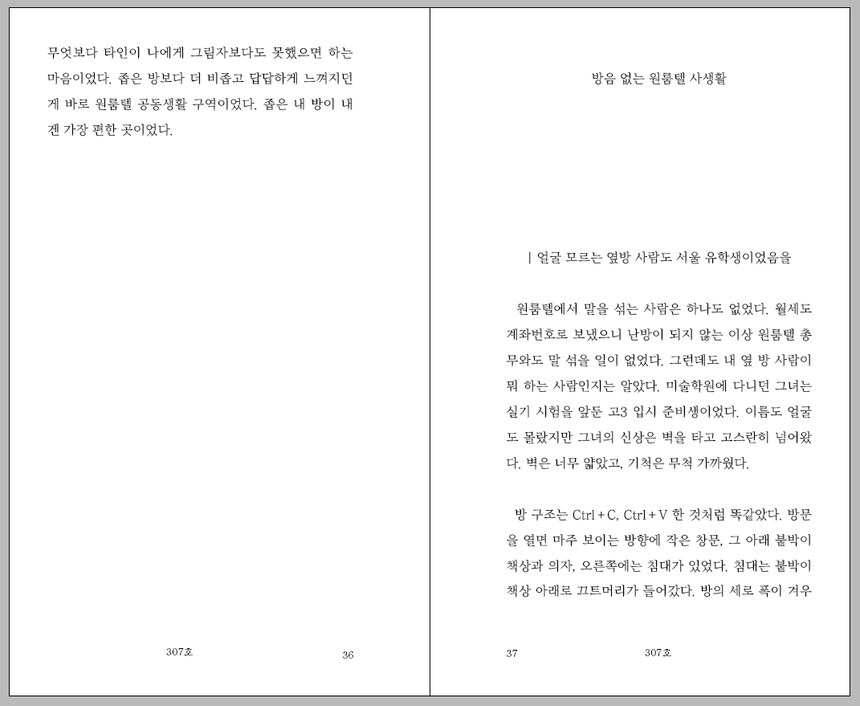 스무 살 이후 처음으로 찾은 자기만의 방, 고시원. 이야기는 저자가 보증금 한 푼 없이, 남들과는 출발선이 다를 수밖에 없음을 인정하며 서울의 한 고시원 514호에 입주하면서부터 시작된다.
