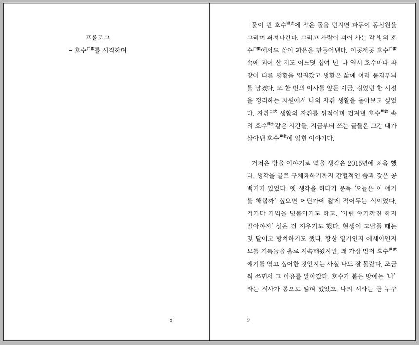 자취생활 내내 제 한 몸 뉘일 곳을 찾아 헤매던 저자는 호수(戶數)마다 들어찬 사람들이 저마다 삶의 파장을 일으키며 살아가는 모습에서 물결치는 호수(湖水)의 이미지를 떠올렸다.