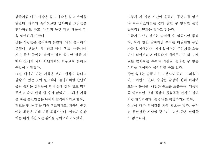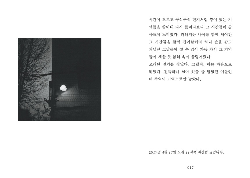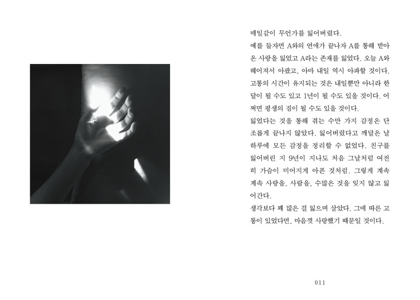 세상의 모든 고통이 나의 몫인 것처럼 살았을 때. 덕분에 유통기한이 지나버린 음지의 시간에서 잃어버린 것들에 대한 기억을 애써 끌어안고 살아간다. 감정과 일상에 세밀하게 깃든 섬세한 시선으로 저자는 일기처럼 써내려간다. 감정과 시간의 방향이 꼭 같지는 않을 거라는 마음. 서정적인 흑백사진과 함께 마음을 잔잔히 울리는 물결이 부드럽게 흐른다.