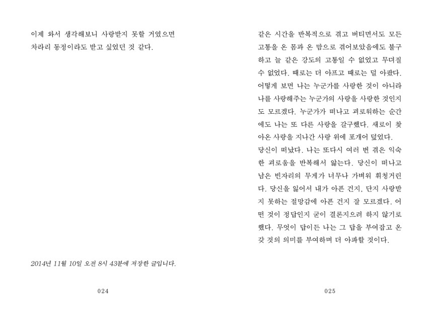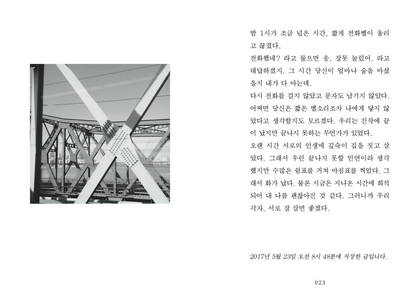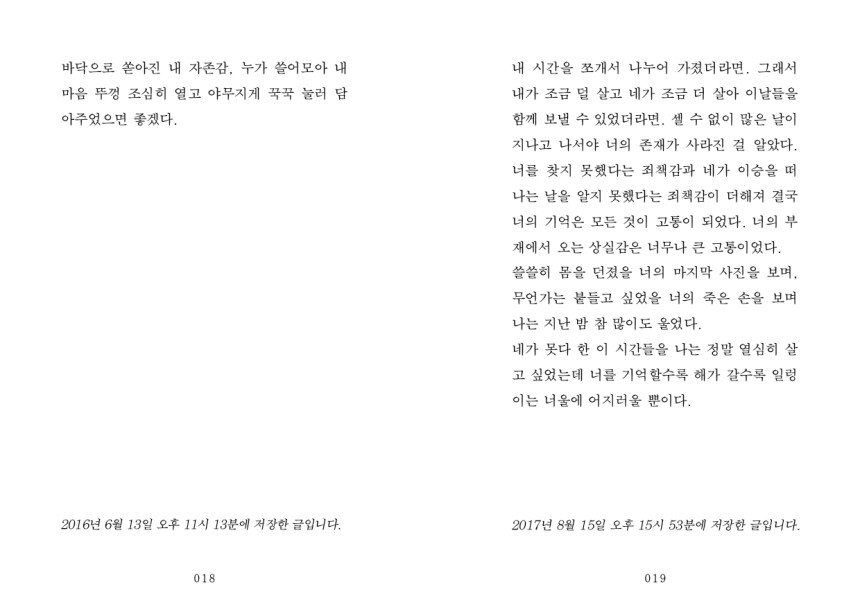 ‘작은 실수 하나를 떨구고 그리움이 삽시간에 번져 얼룩이 남았다. 얼룩에 너의 얼굴이 있었다. 너의 시선이 머뭇거리는 내 발끝을 바라보고 있었다.’