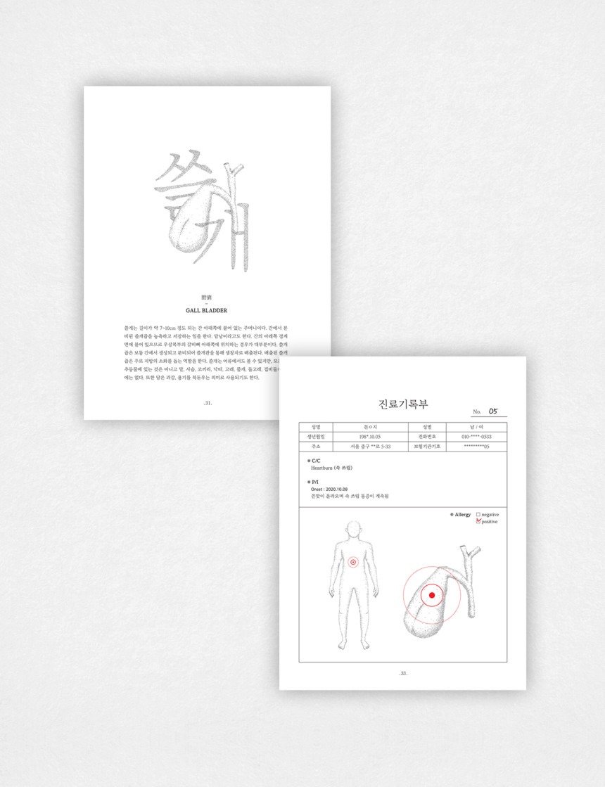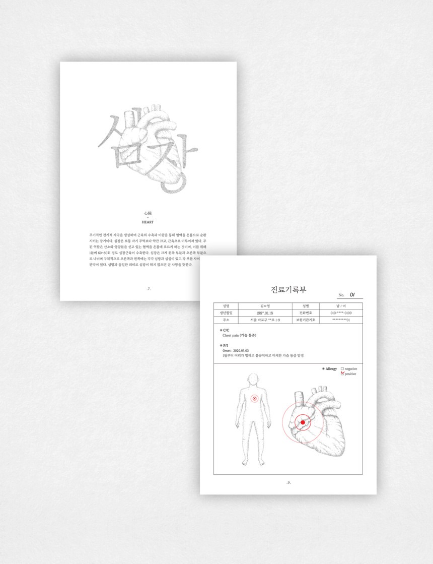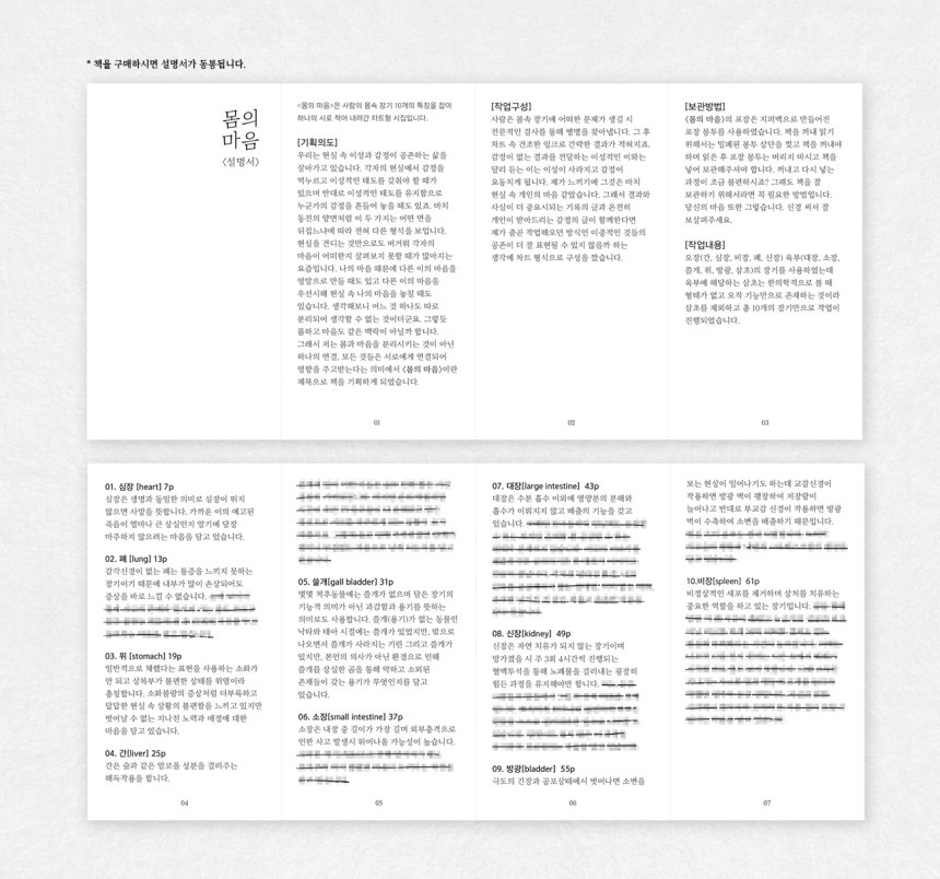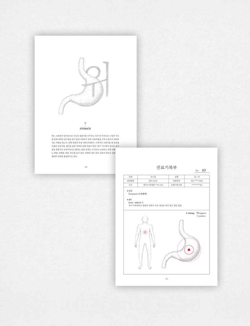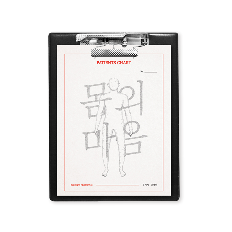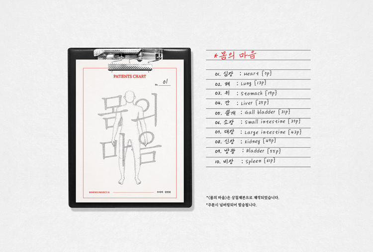<몸의 마음>은 사람의 몸 속 장기 10개의 특징을 잡아 하나의 시로 적어 내려간 차트형 시집입니다. 장기의 설명을 시작으로 진료기록부를 거쳐 하나의 시로 완성됩니다. 진료기록부에 적힌 건조하고 딱딱한 글들이 현실이라면 다음 장으로 이어지는 시는 현실을 감당하고 있는 마음을 표현하고 있습니다.
