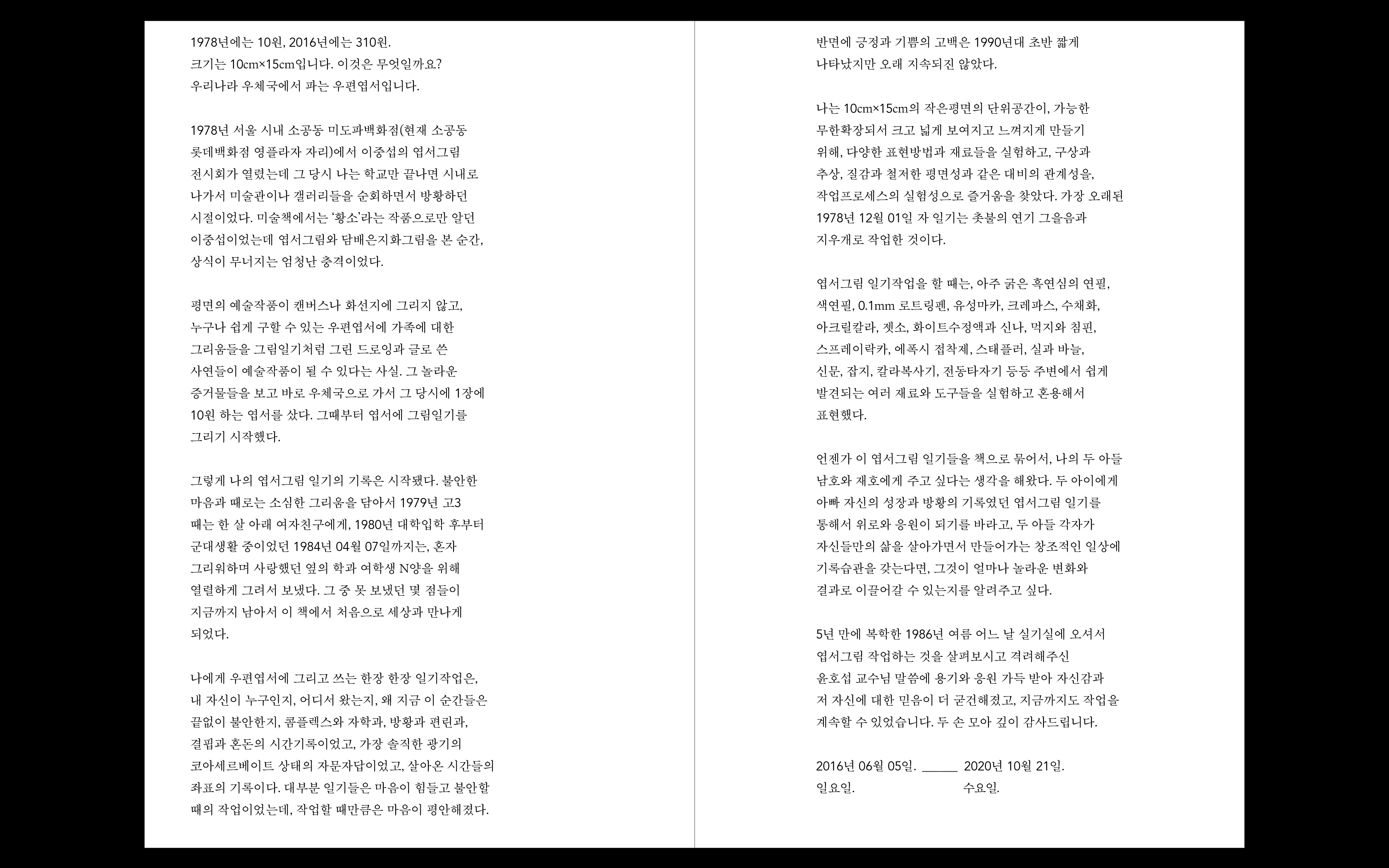 한편으로 일기라는 기록 형식은 1인칭 예술이다. 그렇기 때문에 노력하면 우리 모두가 삶 속에서 예술가가 될 수 있다. 나는 <벌거숭이 호철님>에서 시간과 감정을 붙잡아두는 기록의 중요성을 생각하게 된다. 어제는 그렇게나 확실하고 강렬한 감정으로 썼던 일기 기록들이, 그것들을 바라보는 오늘의 나에게는 낯설거나 텅 빈 것이 되어버린다. 하지만 벌거숭이 호철님은 지금도 수십 년 전에 만든 엽서그림 일기를 보며 바로 그때의 정념을 그대로 호출한다. 그래서 이 책을 펼칠 때, 나는 나만의 기록 방식을 어떻게 만들어나갈지 고민하게 된다. 보다 잘 살아지기 위해서. 이 책을 읽게 될 독자들도 엽서그림 일기로부터 많은 기록의 영감을 받을 수 있을 것 같다.