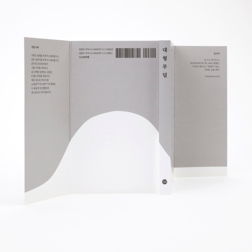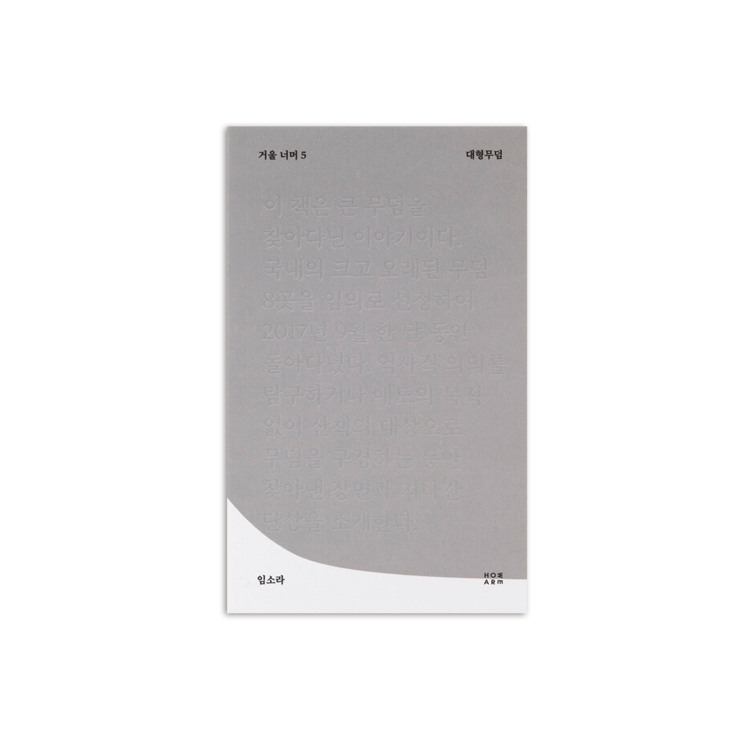 거울 너머를 바라보고 글 너머를 상상하는 산문집 ‘거울 너머’는 매호 하나의 주제 아래 논픽션과 픽션의 형태로 두 달에 한 번 총 6권 발행되는 시리즈이다. ‘거울 너머’ 5권으로 출간된 <대형무덤>은 큰 무덤을 찾아다닌 이야기이다. 국내의 크고 오래된 무덤 8곳을 임의로 선정하여 2017년 9월 한 달 동안 돌아다녔다. 역사적 의의를 탐구하거나 애도의 목적 없이 산책의 대상으로 무덤을 구경하는 동안 찾아낸 장면과 지나간 단상을 소개한다.