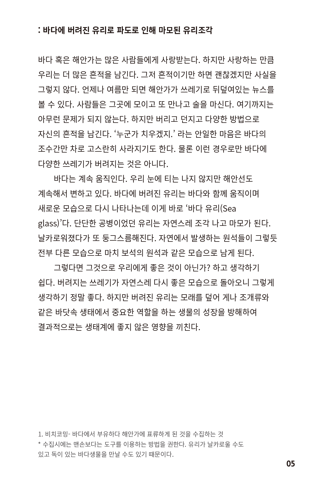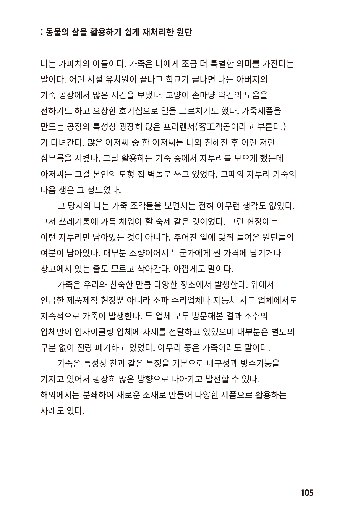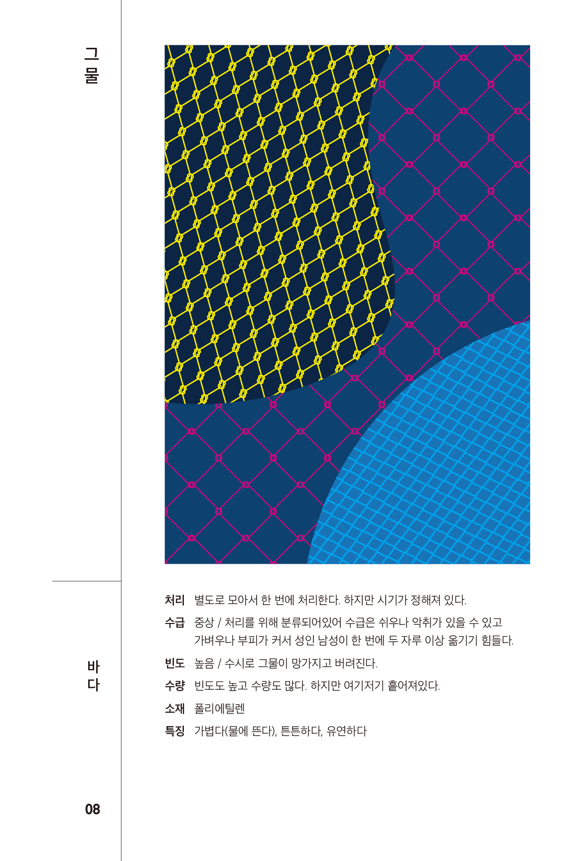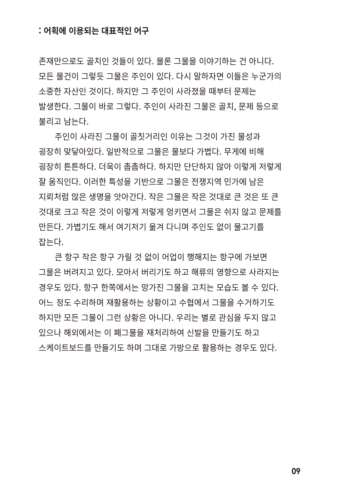 아직 튼튼하거나 쓸 만한 매력을 가진 친구들도 많지만, 아무도 자세히 들여다 봐주지 않아서 부유해버 리는 경우가 많다. 그렇게 부유하다가 어느 순간 모두가 고개를 돌리는 골칫거리 쓰래기로 변모한다. 이 책은 그런 사연을 가진, 아직 꽤 쓸모가 있는 소재를 모은 책이다.