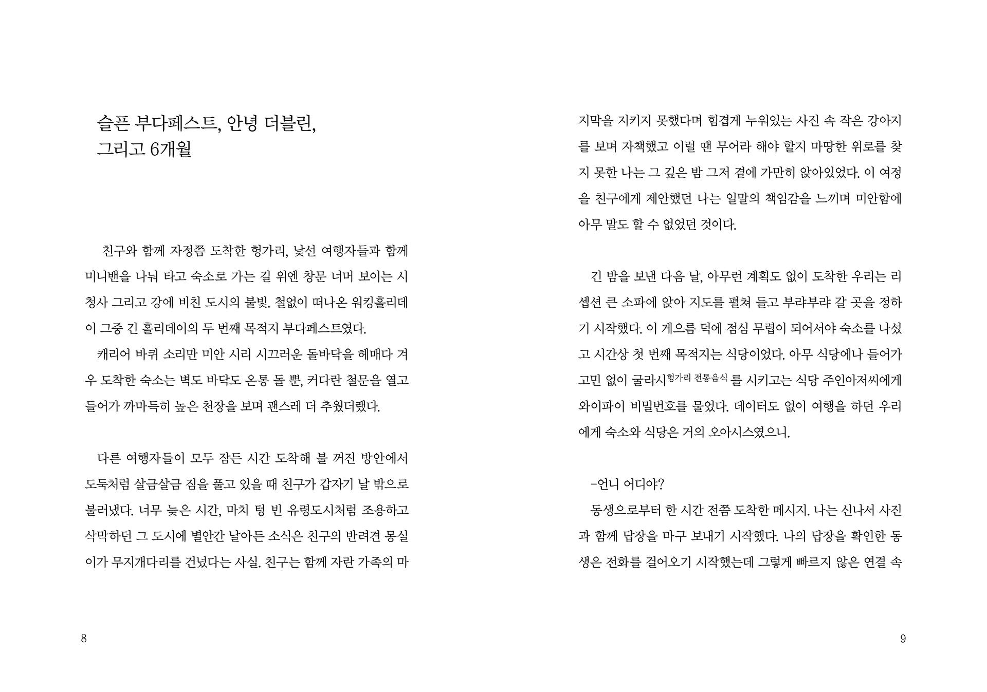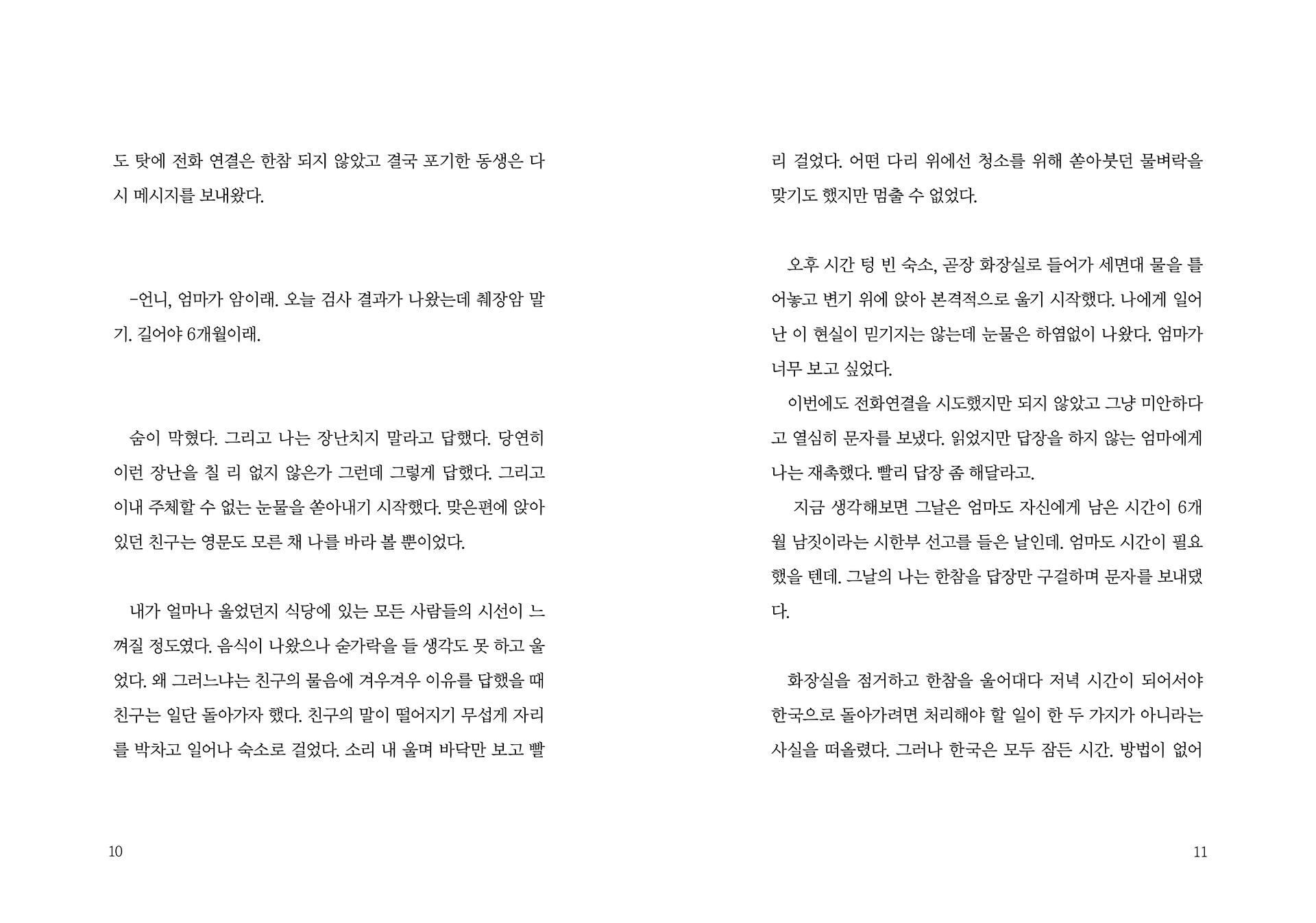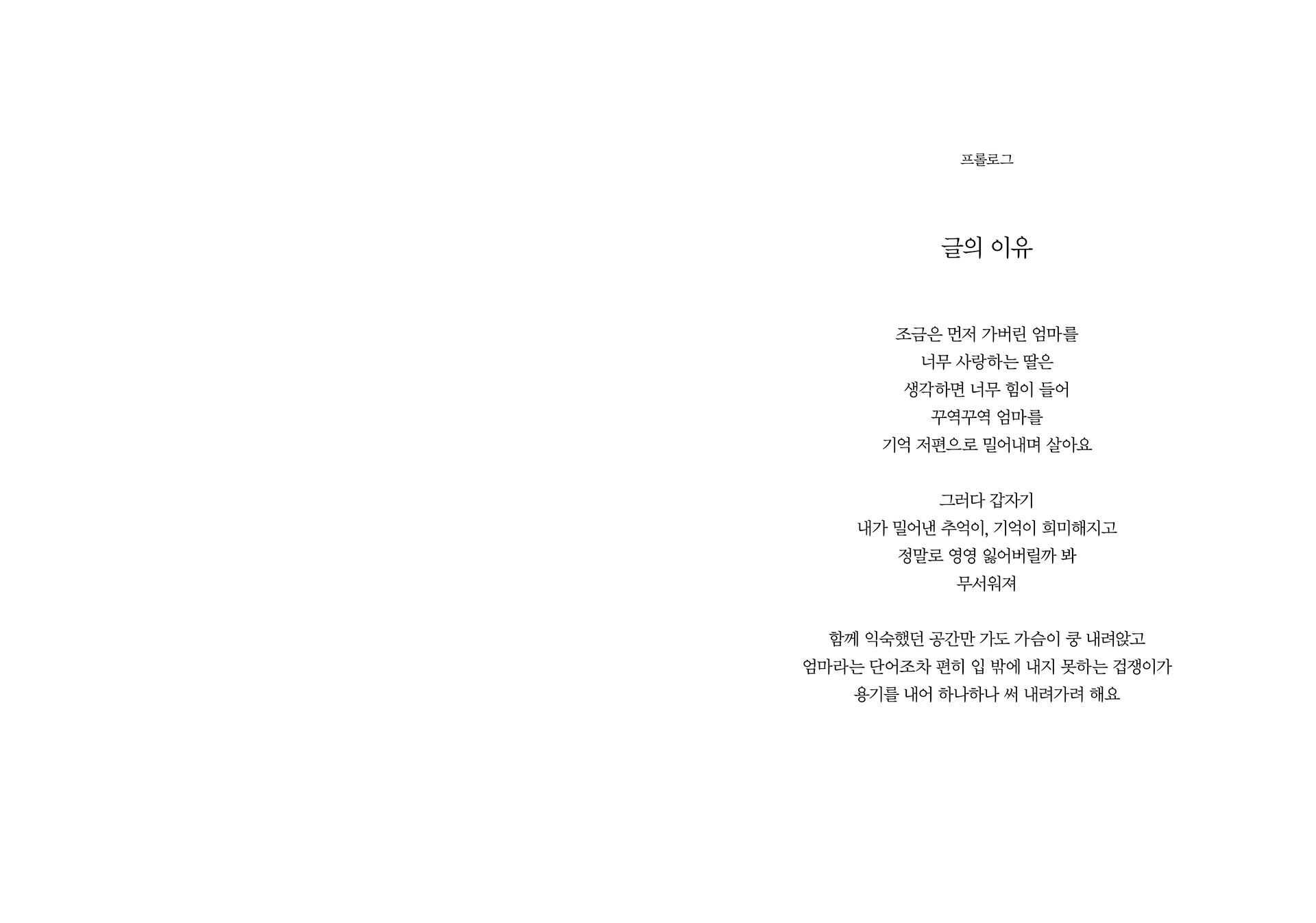 처음, 글을 쓰기 시작한 이유는 단지 기억을 위한 기록의 용도일 뿐 출판을 위한 것은 아니었어요. 그렇기에 꾸밈없이 솔직할 수 있었던 글들을 6년이 지나 모아놓고 보니 당시의 감정이 생각나 애틋하기도, 점점 괜찮아지는 저 자신을 발견할 수도 있었지요. 어쩌면 글쓰기 자체를 통해 스스로를 위로받고 있었던 것 같기도 합니다. 아주 개인적인 일을 계기로 개인적인 생각을 담은 서투른 글이지만 저에게 이 글이 그랬듯, 누군가에겐 공감이 되는 이야기이기를 또 누군가에겐 위로가 되는 이야기가 되기를 바랍니다.