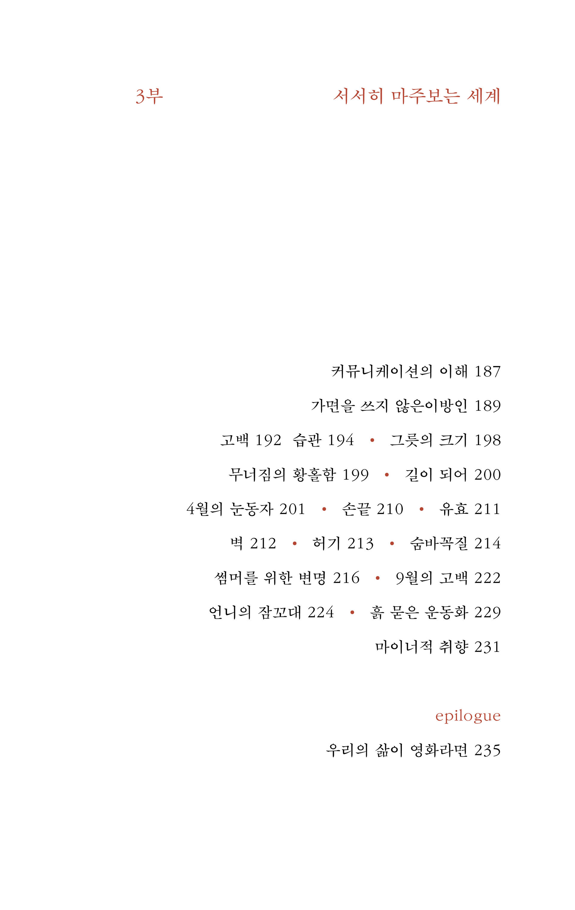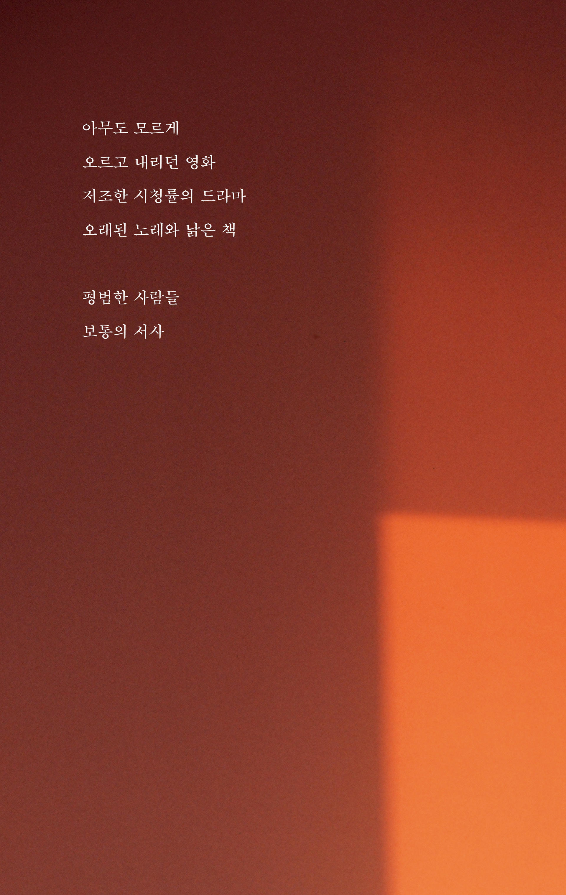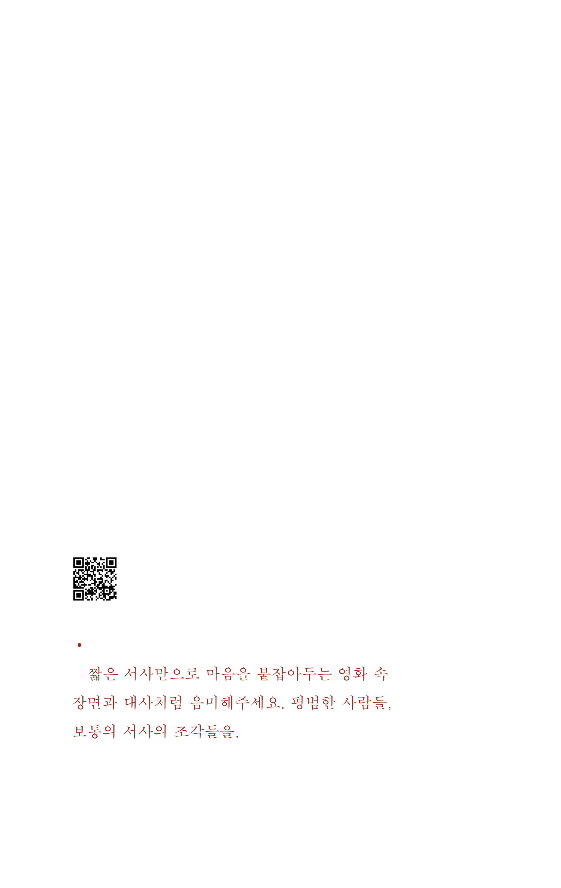 『지금, 여기를 놓친 채 그때, 거기를 말한들』, 『숱한 사람들 속을 헤집고 나왔어도』, 『고요한 세계에 독백을 남길 때』 등 간결한 문장들 속에 일상을 향한 섬세한 관찰과 다정하고 단단한 문장을 전해온 가랑비메이커가 이번에는 책 속 <그 혹은 그녀>의 삶을 빌려 누구나 마주했지만 아무도 모르게 지나쳐 왔던 서사들을 짧은 소설의 형태로 이야기한다. 마치 영화 속의 장면을 옮겨온 듯한 이야기는 우리를 울리거나 웃기고 멀리 내치거나 깊이 안아주기도 할 것이다. 깊어지는 계절에 마주하는 이야기가 당신의 삶과 포개지는 경험을 통해, 조금 더 다정한 내일을 기대할 수 있기를.