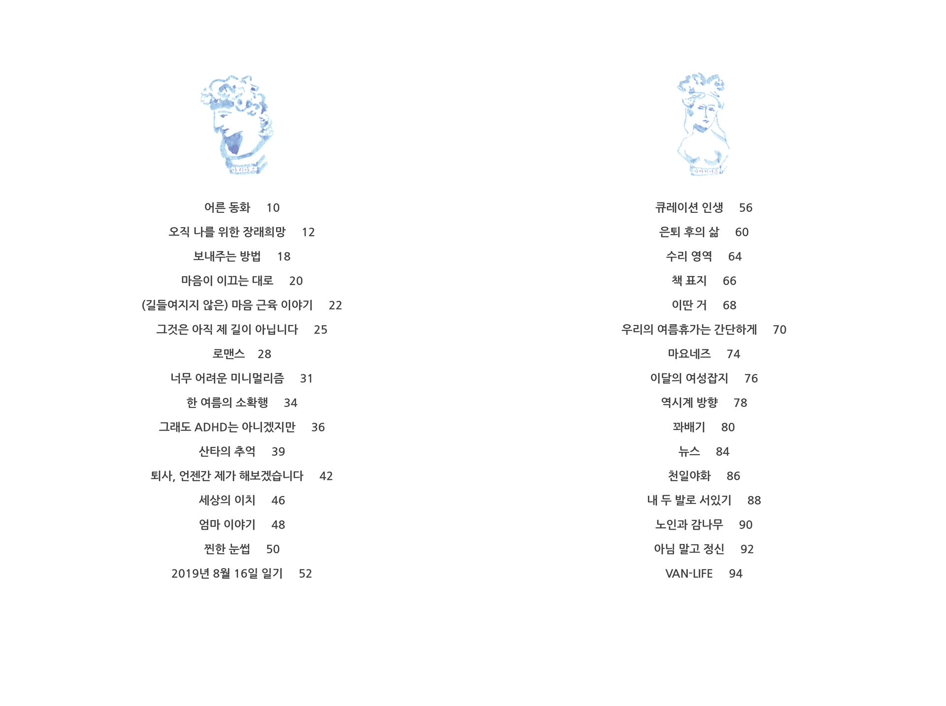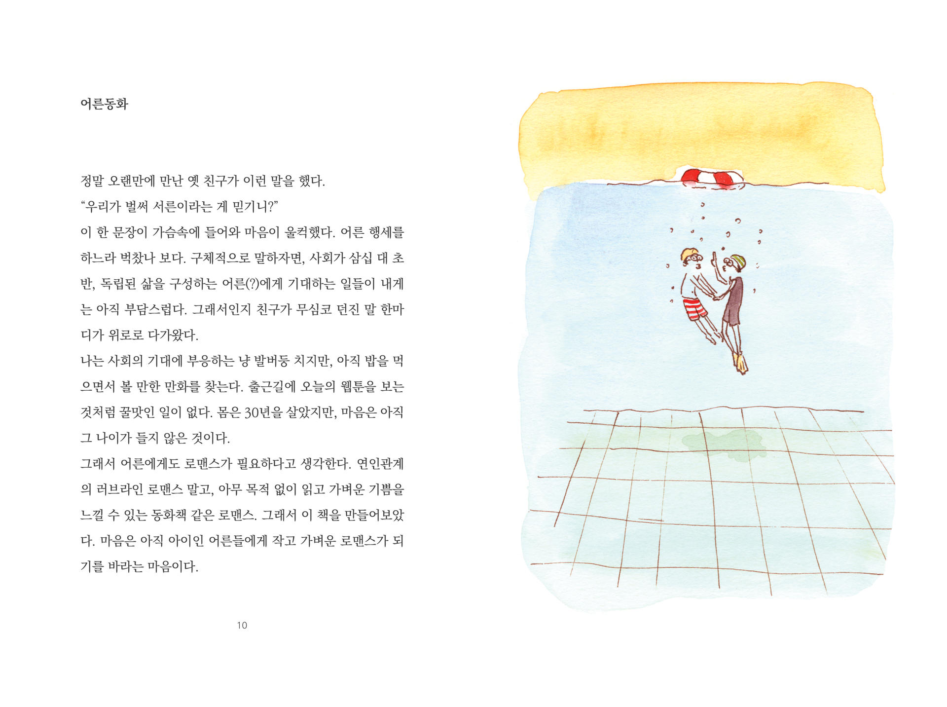 어느날 보니, 세금을 내는 어른이 되어버렸습니다. 문득, 어른에게도 동화같은 로맨스가 필요하다는 생각이 듭니다. 연인관계의 러브라인 로맨스 말고, 아무 목적 없이 읽고 가벼운 기쁨을 느낄 수 있는 동화책 같은 로맨스. 그래서 이 책을 만들어보았습니다. 어른스러운, 혹은 어른다운 고민들 속에서도 우리만의 순수함을 간직하기를 바라는 마음입니다.