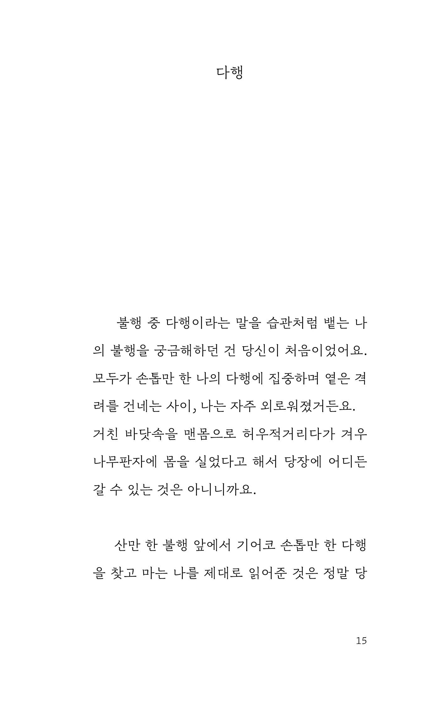 “제게는 수많은 이름들이 있어요. 손을 뻗어서닿을 수는 없지만 두 눈을 감으면 비로소 선명해지는 이름들. (중략) 멀어지는 이름들의 등을 쓰다듬으며 긴 계절을 보냈습니다. 오래된 편지가 우리의 늦은 대화가 될 수 있을까요.”